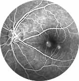 Fluoreszenzangiogramm: die krankhafte weiße Gefäss-Veränderung ist auf dem Bild oben nicht sichtbar