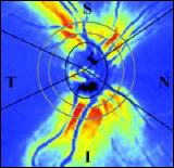 Vermessung der Nervenfaserschicht: Vermessung der Nervenzellenschicht im Auge mit dem GDx Nerve Fiber Analyzer der Fa. Zeiss-Meditec. Man spürt an sich selbst das Glaukom über Jahre nicht - weder durch Kopfschmerzen, Augeschmerzen, noch durch verminderte Sehkraft. Daher sucht man erfolgreich mit speziellen und neuesten Methoden frühzeitig nach dieser heimtückischen Krankheit. Hierzu gehört nicht nur die Messung des Augeninnendrucks oder die Betrachtung des Sehnervenkopfes, sondern auch die genaue Beurteilung der Nervenfaserschicht am Augenhintergrund. Diese weist bei fortschreitender Glaukomerkrankung eine zunehmende Ausdünnung oder auch lokale Veränderungen auf. Eine präzise Beurteilung ist nur mit der Nervenfaserschichtuntersuchung, die auch Nervenfaser-Polarimetrie genannt wird, möglich.Mit diesem Verfahren wird nicht nur die Oberflächenstruktur, sondern auch die Dicke der Nervenfaserschicht des Auges in dem Bereich der Netzhaut gemessen,in dem der Sehnerv aus dem Auge austritt.Nervenfaserkarte: Helle Farben stellen stärkere Schichten dar Eine Untersuchung mit dem GDx Nerve Fiber Analyzer benötigt wenig Zeit, ist vollkommen schmerzlos, blendfrei und ohne lästige Folgen. Sie erfordert keine Weitstellung der Pupille. Der Patient blickt einfach auf die blinkenden Ziellinien im Gerät. Ein unsichtbarer Laserstrahl durchleuchtet die Nervenfaserschicht der Netzhaut zweimal. Durch die Veränderung der Geschwindigkeit des Strahls kann der GDx die Dicke der Nervenschicht errechnen. Nach einer kurzen Auswertung werden die Befunde jeder Untersuchung sofort mit einer eingebauten Datenbank, die Normalwerte enthält, verglichen und zum späteren Vergleich abgespeichert. Veränderungen der Dicke der Nervenfaserschicht durch ein Glaukom können so im Rahmen von regelmäßigen Vorsorgeuntersuchungen extrem frühzeitig erkannt werden.
