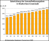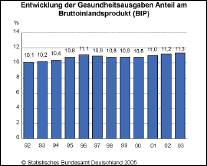Die Krankenhäuser erhielten 46% des Geldes, 3x soviel wie die ambulant tätigen Ärzte mit 15.7% - soviel wie für Medikamente mit 15.6% ausgegeben wurde.   Zunahme der Gesundheitskosten von 1992-2003 lt. Statistisches Bundesamt nominal   und als Anteil am Bruttoinlandsprodukt. Von Kostenexplosion im Gesundheitswesen keine Rede! Der Anstieg beträgt nur 1,2%!!! Wegen vielschichtiger Verluste auf der Einnahmenseite haben wir ein Problem: "Einnahmenimplosion"!