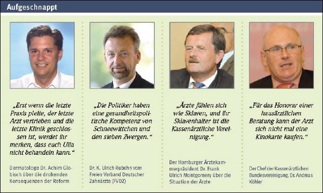 Kritik von Schmidt Bundesgesundheitsministerin Ulla Schmidt (SPD) kritisierte die Proteste scharf und warnte vor einer Eskalation. Wenn Patienten wegen der Aktionen nicht "wohnortnah" versorgt werden könnten, sei das eine Pflichtverletzung, die von der Selbstverwaltung sanktioniert werden müsse, sagte ihr Sprecher Klaus Vater in Berlin. Eine bloße Notfallversorgung reiche nicht aus. Ein Recht zum Widerstand oder zum Boykott stehe den Kassenärzten wegen der geplanten Honorarreform nicht zu und könne von der Regierung auch nicht hingenommen werden. Schmidt hatte es als ärgerlich bezeichnet, "wenn Patienten oder kranke Menschen in Geiselhaft genommen werden für Forderungen nach mehr Geld". Die Klage eines Arztes, der sich nicht als Geiselnehmer beschimpfen lassen wollte wurde aber abgewiesen. --> hier der Bericht der taz dazu ________________________________________________________________________________________________