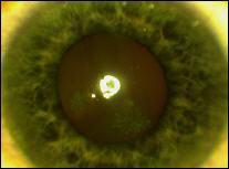 Herpesinfektion der Hornhaut. Diese Erkrankung macht sich zunächst nur als Fremdkörpergefühl, später mit Rötung bemerkbar. Solche lästigen Empfindungen gibt es auch bei trockenen Augen. In Gegensatz dazu droht hier Sehschärfenverlust oder sogar Verlust des Auges. Frühzeitig behandelt sind Komplikationen vermeidbar. Verschleppt sieht's so aus wie auf dem nebenstehenden Bild!