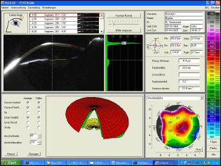 Mit der Pentacam kann nicht nur die Pachymetrie (Dicke der Horhaut) und eine Topometrie (Darstellung der Hornhautoberfläche) gemessen werden, auch ein optischer Schnitt durch das Auge (Scheimpflugkamera) ist möglich.