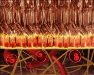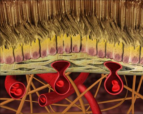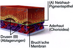 Das Netzhaut-Pigmentepithel (A), eine lichtabschirmende Zellschicht, dient der Versorgung der Netzhaut mit Nährstoffen und dem Abtransport von Stoffwechselprodukten. Darüber hinaus verhindert es, dass Blutgefäße aus der Aderhaut (Chorioidea) in die Netzhaut einwachsen.Im Verlauf der Erkrankung bilden sich Ablagerungen aus Stoffwechselprodukten, die als gelbe Flecken erscheinen und Drusen (B) genannt werden. Außerdem kann es durch eine Reizung des Netzhaut-Pigmentepithels zur Bildung kleiner brauner Klümpchen, den sogenannten fokalen Pigmentveränderungen kommen. Im frühen Stadium der AMD erkennt Ihr Augenarzt bei der Untersuchung des Augenhintergrundes möglicherweise Drusen (gelbe Flecken) oder fokale Pigmentveränderun gen (braune Flecken). Zu diesem Zeitpunkt kann Ihre Sehkraft noch normal sein. Bei einem Drittel aller Menschen über 75 Jahre lassen sich solche Zeichen finden, doch nur jeder zehnte Betroffene erleidet einen Sehverlust.