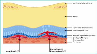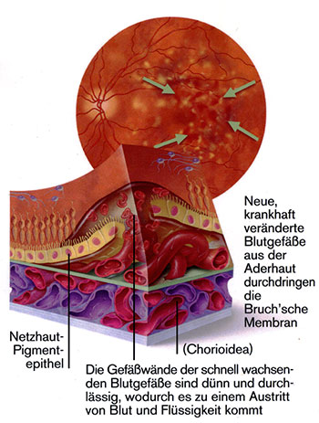Die feuchte Form triff auf, wenn das Netzhaut-Pigmentepithel nicht mehr verhindern kann, dass Aderhaut-Blutgefäße in die Netzhaut einwachsen. Sobald diese Blutgefäße in die Netzhaut eingedrungen sind, breiten sie sich dort ungehemmt aus, ähnlich den Wurzeln einer Pflanze. Die Wände dieser schnell wachsenden Blutgefäße sind dünn und durchlässig, wodurch es zum Austritt von Blut und Flüssigkeit sowie zur Bildung von Narbengewebe und damit verbunden zu einem Sehverlust kommen kann.