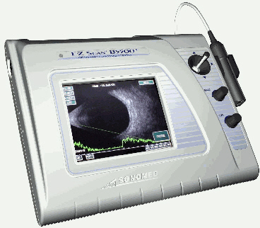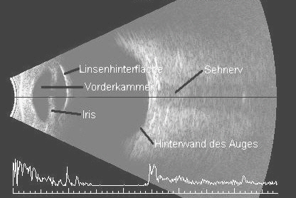 Mit Ultraschalldiagnostik lässt sich schmerzlos das Auge im Schnittbild untersuchen und vermessen. Dies ist beispielsweise für die Bestimmung der Stärke einer Intraocularlinse zur Implantation bei der Staroperation nötig.