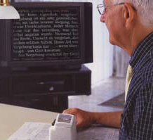 Bildschirmlesegeräte (Fernsehlesegeräte) z.B."MAXLUPE", die elektronische Leselupe MAXLUPE ermöglicht das Lesen und Schreiben von Texten und das Betrachten von farbigen Bildern. Eine Kamera nimmt eine Text- oder Bildvorlage auf und stellt diese auf einem Bildschirm vergrössert dar. Die stufenlos regelbare Vergrößerung (4- bis 20-fach) sorgt für eine variable Vergrößerung, die sich den Bedürfnissen der Augen optimal anpasst.